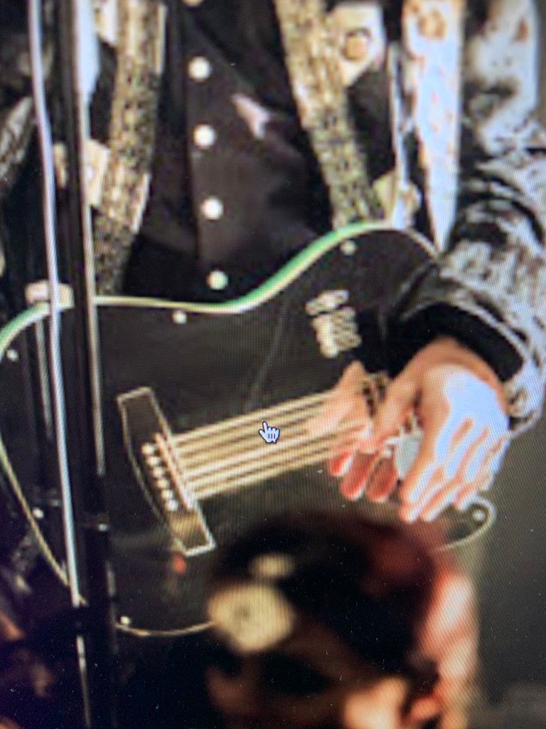 Zooming in on the stills from the video, the green body of the ’90s Acousticaster can clearly be seen. It looks like the headstock has had a paint job, or perhaps it’s a new neck. Either way I think this is fundamentally the same guitar.